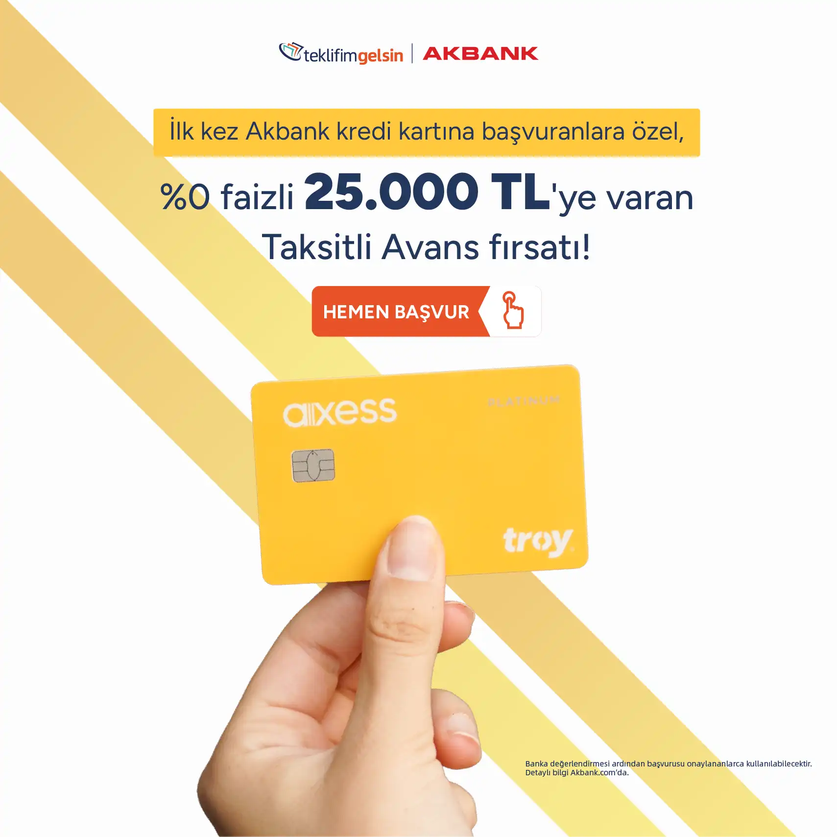 • İlk kez Akbank kredi kartına başvur, %0 faizli 25.000 TL’ye varan taksitli avans fırsatını kaçırma! Başvur'a tıklayarak, kampanya koşullarına ulaşabilirsin.